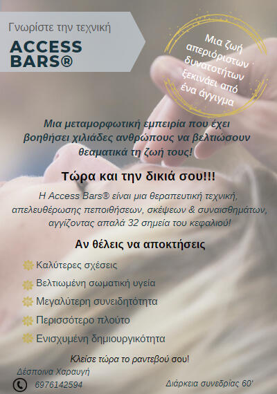 Τα Bars είναι η τεχνική που όσο την επιλέγεις αλλάζει η ζωή σου. Νιώθεις πιο ζωντανός στο σώμα σου, βελτιώνεις τις σχέσεις σου, αποκτάς περισσότερη δημιουργικότητα, σεξουαλική ενέργεια και έχεις διαύγεια πνεύματος στις κινήσεις σου.Η τεχνική αυτή έχει γίνει δημοφιλής στο εξωτερικό, σε νοσοκομεία και εταιρίες για την ευεξία των ασθενών και των στελεχών επιχειρήσεων.Τα 32 σημεία στο κεφάλι που αγγίζονται απαλά σβήνουν εκατοντάδες χιλιάδες πεποιθήσεις και σκέψεις από το υποσυνείδητο με μία μόνο συνεδρία!Θέλεις να αλλάξεις τη ζωή σου;